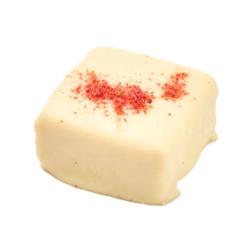 Strawberry and cream ganache, covered in 28% white Belgian chocolate.